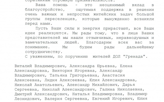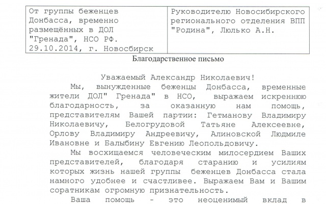 Беженцы Новороссии написали благодарственное письмо, которое адресовано председателю регионального отделения партии "РОДИНА" в Новосибирской области Александру Люлько.