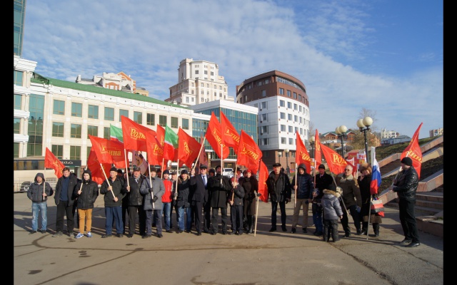 К 11 часам утра к памятнику Вахитову начали стекаться группы патриотов, многие - с флагами партии. Также присутствовали активисты Добровольческого движения особого назначения. Эта организация очень тесно связана с партией "РОДИНА": она активно выступает в поддержку армии, флота и оборонно-промышленного комплекса России. Были также флаги Российской Федерации и Татарстана.