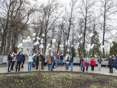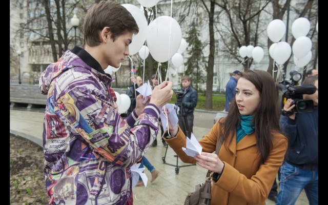 Участники, люди разных возрастов, большинство, конечно, студентов, сложили из бумаги белых голубей, по технике оригами. Тех, кто делал это впервые научили более опытные участники. Затем каждого "голубя мира" привязали к белому воздушному шару. Выстроившись в слово "мир", в едином порыве под дружный хор "Мы - за мир на Украине!" участники "запустили" в небо своих "голубей". К слову, в акции принимали участие и просто случайные прохожие-гости из Москвы, заинтересовавшиеся действом и поддержавшие идею мира на Украине.