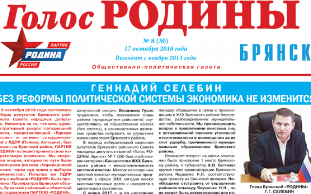 15-тысячным тиражом в полноцветном варианте вышел очередной октябрьский выпуск газеты "Голос РОДИНЫ. Брянск" №8 (30).